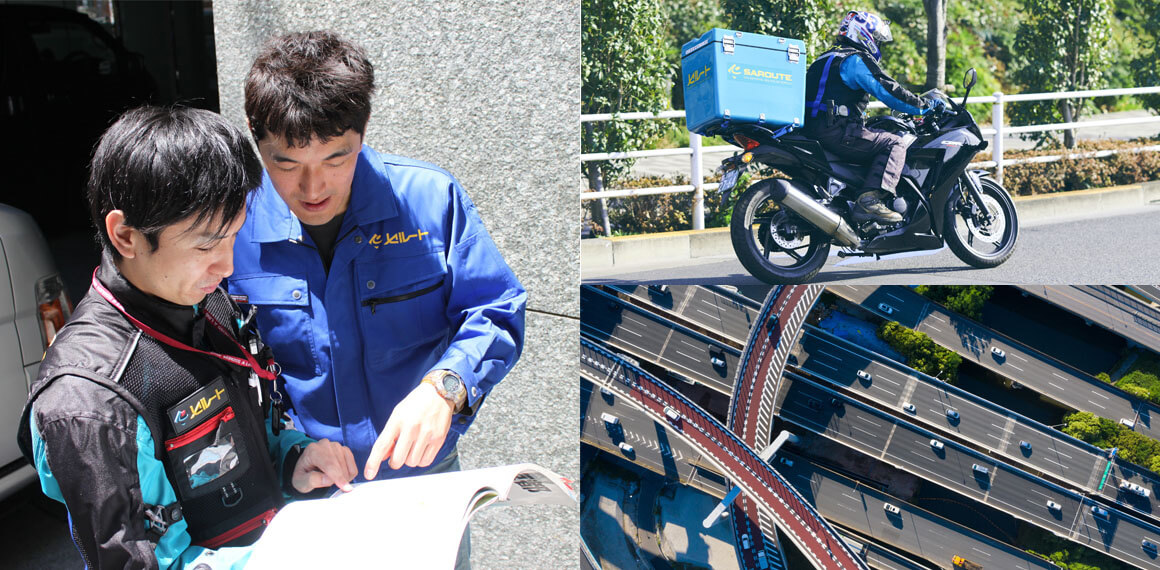 バイク便や軽四輪を使ったスポット便による配送はもちろん、新幹線や飛行機を利用したクイックライン便やハンドキャリー便、定期ルート便、チャーター便、全国一斉手配まで。条件や制約がある配送ニーズにも、コースの設定やスタッフの手配、車両のマネジメントなどを含めてワンストップで対応しています。